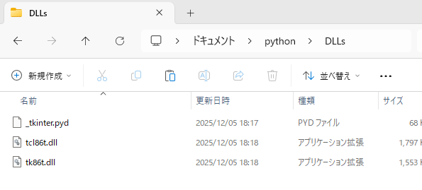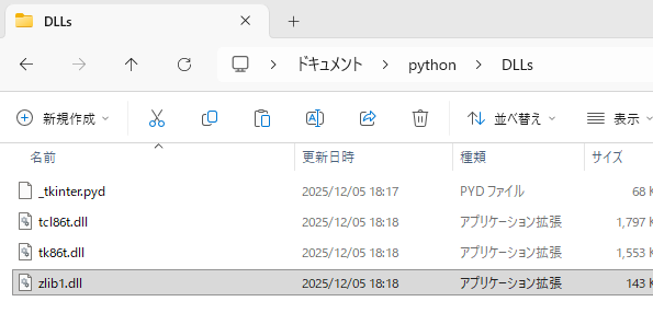 _tkinter エラーは 「本体ではなく孫 DLL 不足」で、今回は zlib1.dll が決定的に不足」と、ChatGPTが教えてくれました(ホントかな?)。