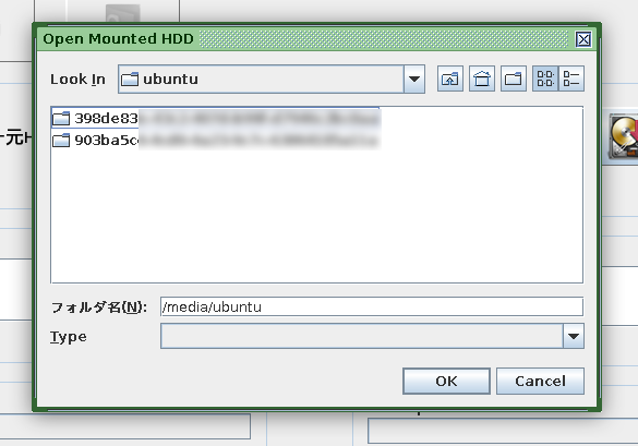 「/media/ubuntu」の下にマウントしたHDD(UUID)が表示されます。